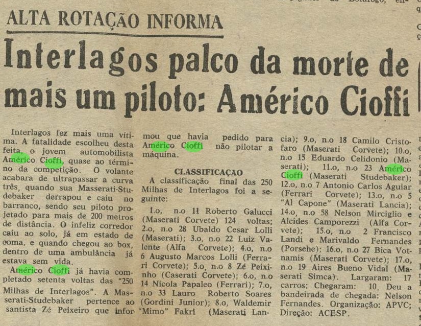 Tratava-se de uma prova de Mecânica Nacional e Sport Internacional, realizada no pouco utilizado circuito externo de Interlagos, um traçado de alta velocidade que incluía as Curvas 1, 2, 3 e a Subida dos Boxes. A notoriamente difícil Curva 3, também conhecida como “Bacião”, devido à sua topografia, localizada no final do "Retão", com cerca de 900 metros de extensão. Embora fosse mais lenta que as Curvas 1 e 2, por ser mais fechada e mais longa, possuía pouca área de escape para proteger os pilotos de uma depressão profunda na parte externa da curva. Cioffi era um piloto relativamente inexperiente e demonstrava nervosismo antes da largada. Então,na volta 71, ocupando a quarta colocação, Américo Cioffi, um novato que tinha participado apenas de quatro corridas, todas com carros de turismo, e que dessa vez pilotava um carro monoposto,de maior potência, antigo e de difícil pilotagem, perdeu o controle em alta velocidade no final do Retão e saiu da pista na Curva 3. O carro capotou diversas vezes, com o piloto atirado fora do carro (naquele tempo não se usava cinto de segurança), caiu de um lado com as quatro rodas para cima e de outro o corpo do piloto. Mas a corrida continuou. Camillo Christofaro abandonou logo em seguida, enquanto Roberto Gallucci liderava com tranquilidade, restando a disputa pelo segundo lugar entre Ubaldo Lolli e Luiz Valente.