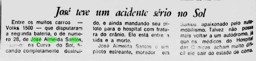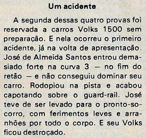 Não sei se já tinha um carro, mas um tempo depois do lançamento do fusca 1500 (Fuscão) ele comprou um já sonhando em participar de uma prova, o que se tornou realidade em 1973 na 1ª Etapa do Campeonato Brasileiro de Sport e Protótipos D-4, que teria 4 provas para estreantes, uma delas para Volks 1500cc., ele se inscreveu e no dia 18 de março ia participar, mas... na volta de apresentação ele perdeu o controle e capotou, não ficou claro em que curva foi, o jornal diz" Curva do Sol" e a revista 4 Rodas diz "Curva 3". O carro ficou destruído e ele foi para o hospital com fratura no crânio.