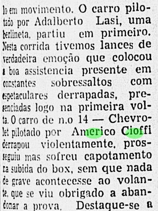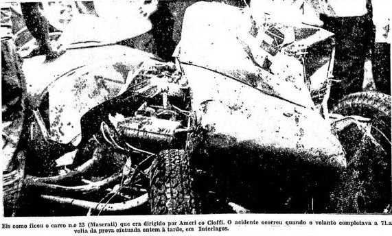 Tratava-se de uma prova de Mecânica Nacional e Sport Internacional, realizada no pouco utilizado circuito externo de Interlagos, um traçado de alta velocidade que incluía as Curvas 1, 2, 3 e a Subida dos Boxes. A notoriamente difícil Curva 3, também conhecida como “Bacião”, devido à sua topografia, localizada no final do "Retão", com cerca de 900 metros de extensão. Embora fosse mais lenta que as Curvas 1 e 2, por ser mais fechada e mais longa, possuía pouca área de escape para proteger os pilotos de uma depressão profunda na parte externa da curva. Cioffi era um piloto relativamente inexperiente e demonstrava nervosismo antes da largada. Então,na volta 71, ocupando a quarta colocação, Américo Cioffi, um novato que tinha participado apenas de quatro corridas, todas com carros de turismo, e que dessa vez pilotava um carro monoposto,de maior potência, antigo e de difícil pilotagem, perdeu o controle em alta velocidade no final do Retão e saiu da pista na Curva 3. O carro capotou diversas vezes, com o piloto atirado fora do carro (naquele tempo não se usava cinto de segurança), caiu de um lado com as quatro rodas para cima e de outro o corpo do piloto. Mas a corrida continuou. Camillo Christofaro abandonou logo em seguida, enquanto Roberto Gallucci liderava com tranquilidade, restando a disputa pelo segundo lugar entre Ubaldo Lolli e Luiz Valente.