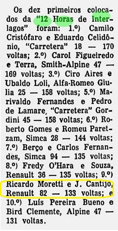 do país, a “12 Horas de Interlagos”, na qual fez dupla com José A. Gontijo, pilotando um Renault 1093, os dois obtiveram um excelente